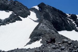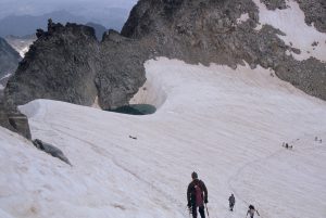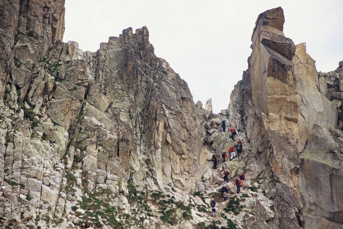 Zgodaj zjutraj smo se v temi v soju svetilk vzpenjali proti Pico de Aneto. Zagruščena pot je bila komaj vidna in zelo slabo označena. Gps nas je zanesljivo vodil do prehoda Portillon Superior (Zgornja vrata), kjer smo se lahko spustili na ledenik, ki vodi do vrha. V vršnem grebenu smo naredili vrvno ograjo in si s samovarovanjem pomagali do vrha. Sestop je potekal po poti vzpona.