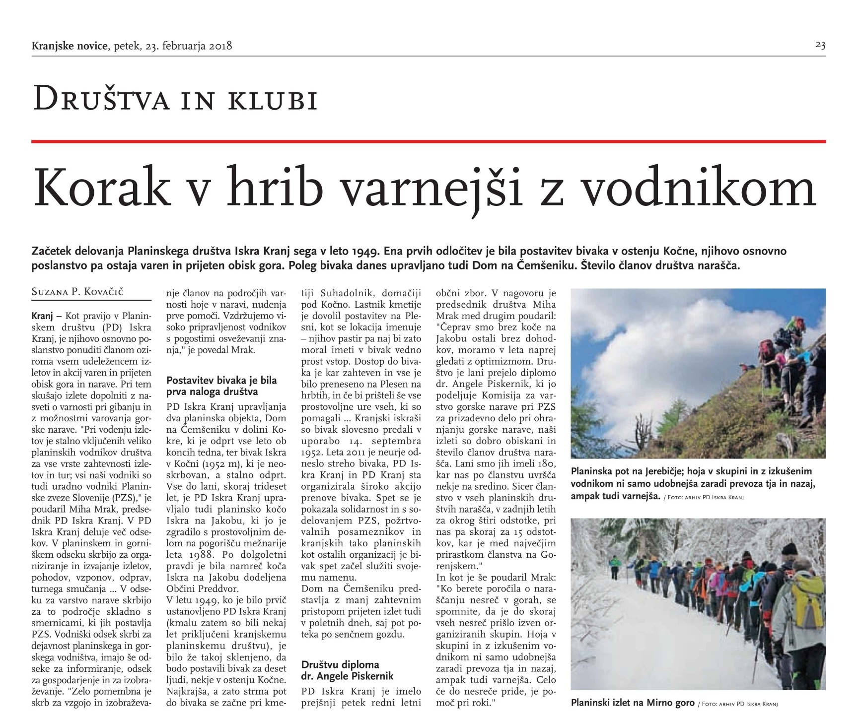 23. februarja je bil v Kranjskih novicah objavljen članek »Korak v hrib varnejši z vodnikom«, v katerem je novinarka Gorenjskega Glasa, Suzana P. Kovačič, predstavila delovanje našega planinskega društva.